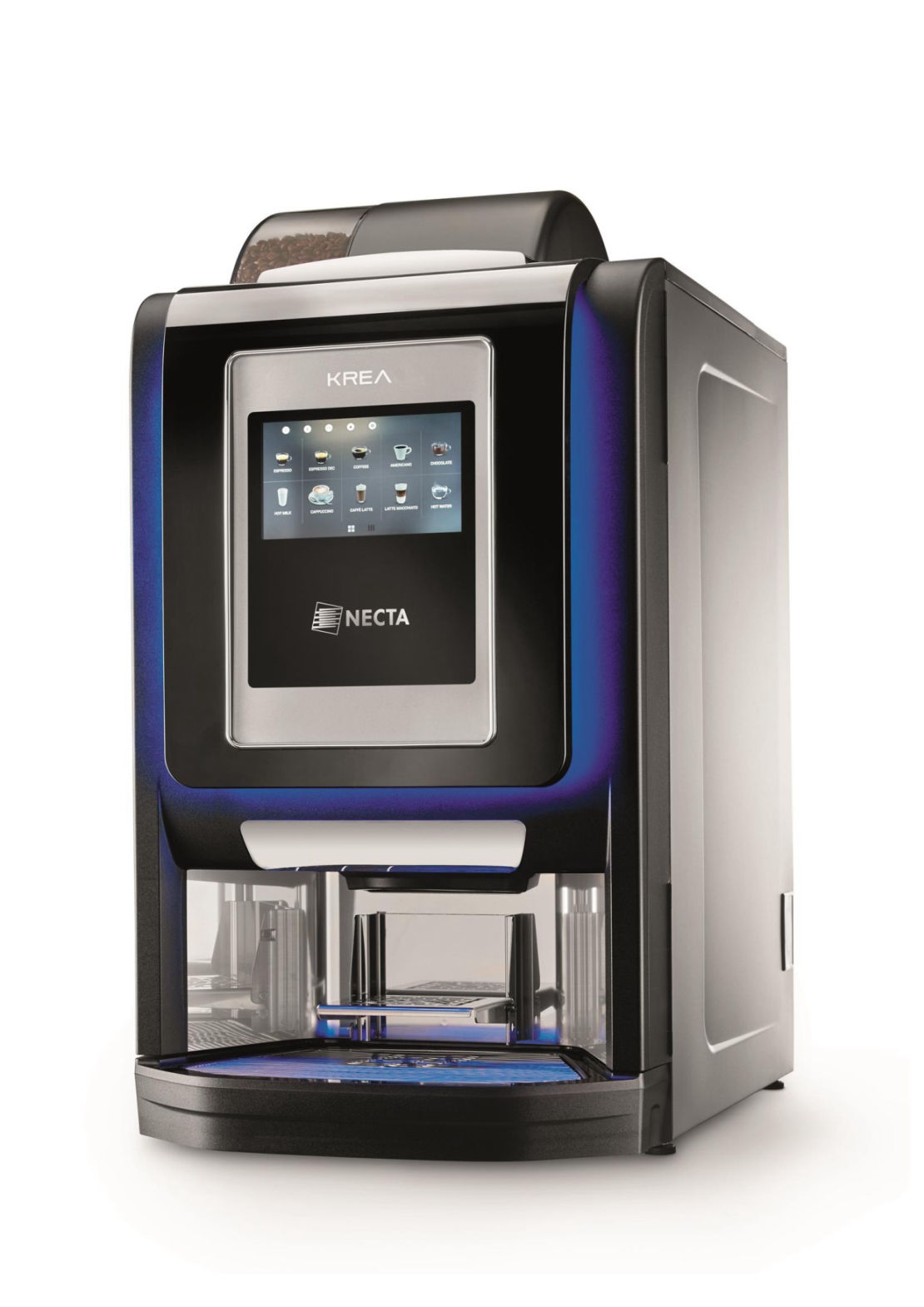 Krea Touch ist das neue, elegante Modell der Necta HoReCa Familie. Exquisites Design, stimmungsvolle Beleuchtung, Chromrahmen, schwarze Hochglanzoberflächen und unvergleichliche Leistung machen Krea Touch zur idealen Lösung für Ihre Kaffeepause. Der große Touch Screen und die benutzerfreundliche Oberfläche bieten viele Auswahlmöglichkeiten sowie flexible und maßgeschneiderte Rezepturen, kundenspezifische Brandings, Verkaufsaktionen und Videomanagement.